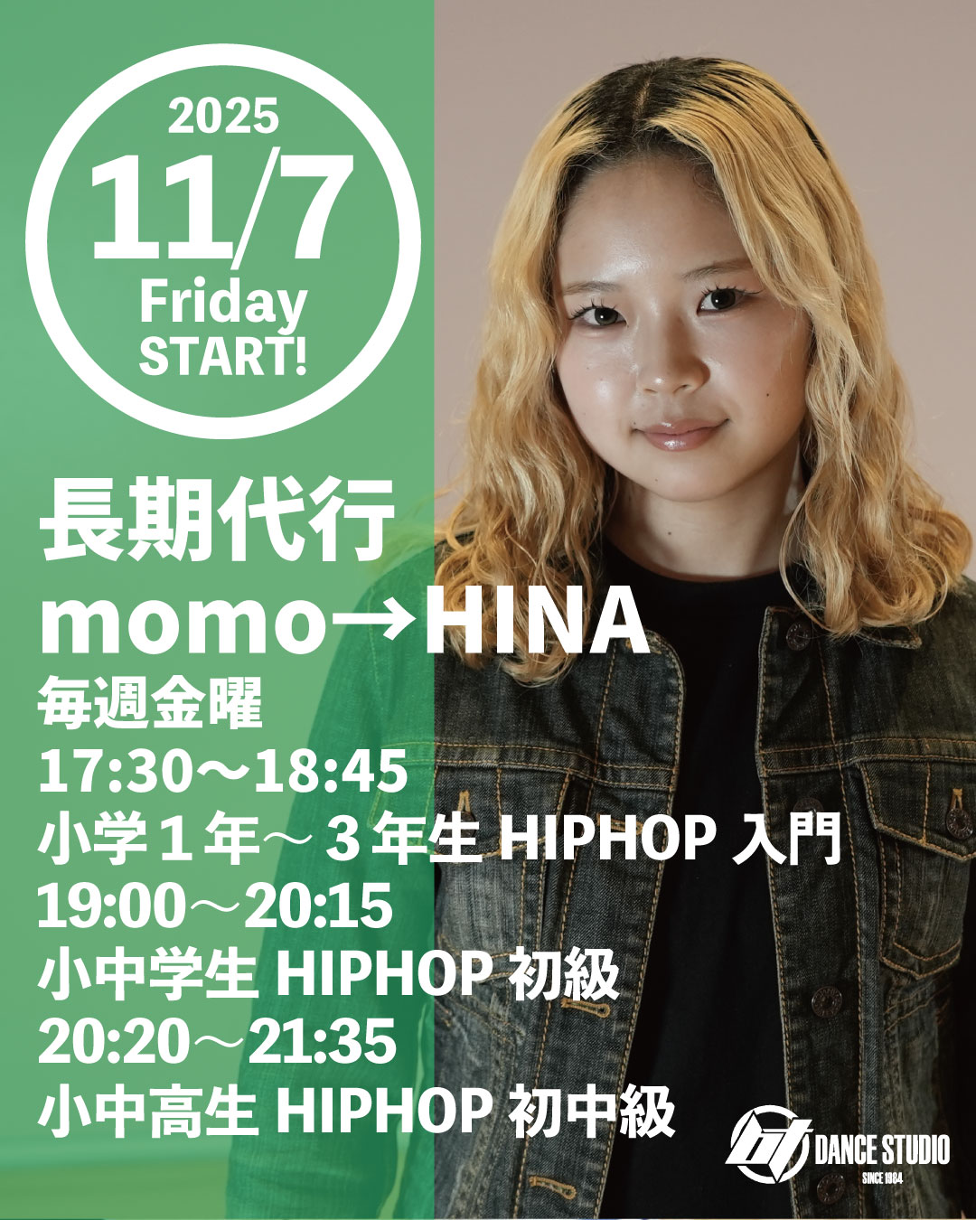 【長期代講】11/7(金)~ momo→HINA/HIPHOPクラス