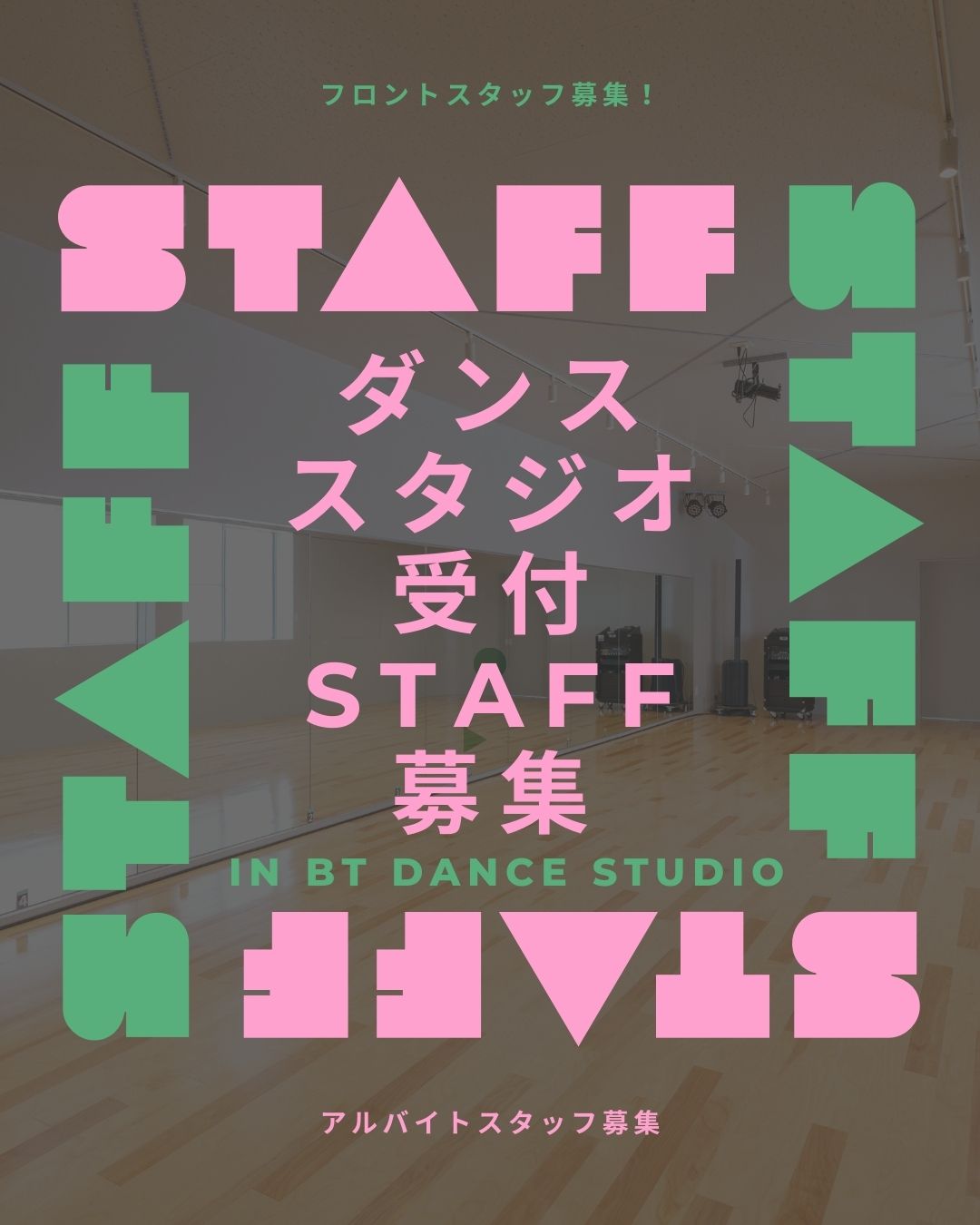 BT Dance Studioでは、一緒にスタジオを盛り上げてくれる「受付スタッフ」と「幼児・キッズクラス対象インストラクター」を募集しています!